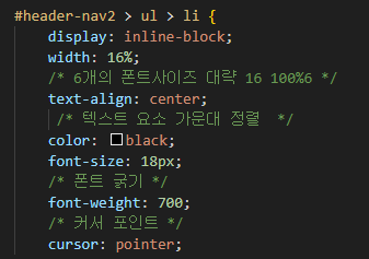 블럭형태인 div와 ul,li를 사용하였기에 inline-block; 속성을 주어 글씨를 일렬로 배치한후 글씨의 간격을 맟추기 위하여 width값을 100%6 하여 대략 16%를 사용함