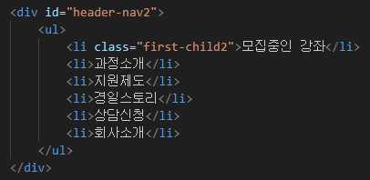 위의 HTML 코딩을 살펴보면 크게 <DIV header-nav2> 안에 <ul> 안에 <li>가 있는것을 알수있다 이를 CSS로 짜보면